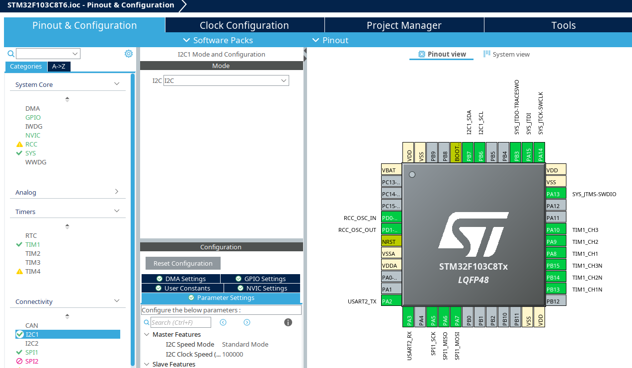 stm32cubeide has a tool to help chose the right pins, this is an example of setting up blue pill for various peripherals: