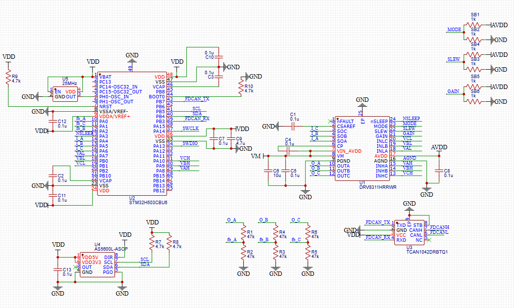 I have a little bit of experience with the DRV8311 chip that you picked out. I have my own board and I also had some feed back on another board by Harry_Brenton. I think you might have an issue with the sleep pin on the DRV8311. If you want to used the LDO on the DRV8311 you need to wake up the chip from sleep first. The chip will not turn on the LDO unless it receives a signal on the sleep pin. In your schematic it looks like VM will go into the DRV8311 chip and then nothing will happen since the sleep pin is low. You’ll need to decide how to get the DRV8311 to wake up to supply power to the STM32. Hope this helps