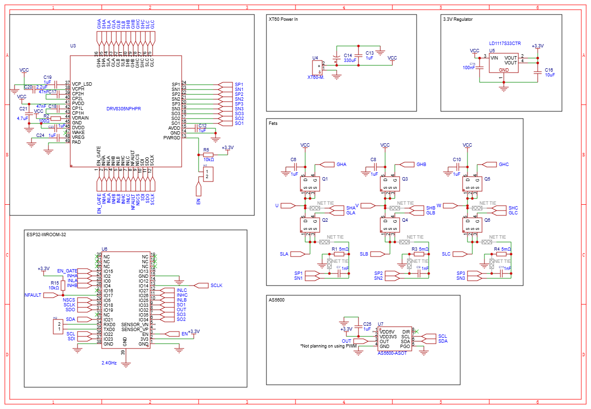 Hi everyone, I am quite new to simpleFOC and motor control theory in general but have put together a schematic based on the DRV8305, NTMFS5C612NL fets and ESP32-WROOM-32. Using an AS5600 for position and low side current sensing on the DRV8305 (which I believe this ESP32 supports). Are there any blatant issues with this schematic? And if so what can I do to rectify/improve them?