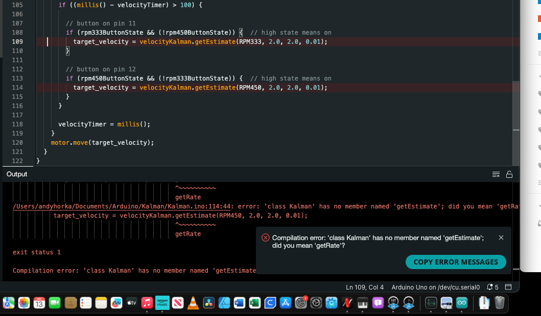 Are you sure? I thought you were using a generic kalman library you found because Valentine forgot to include the link to his. The class in that thread has a function getEstimate, so I think it should work.