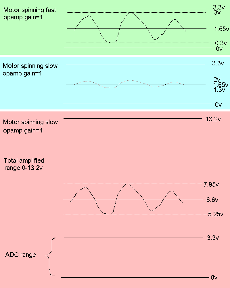 I have been considering a small BLDC-motor could be used to provide an angle and speed signal and again with two amplifications to increase dynamic range. I have tried to look at the EMF-signals from such a motor with one terminal at a fixed center voltage and then you sample the signal from the two other terminals. This is the test set up: