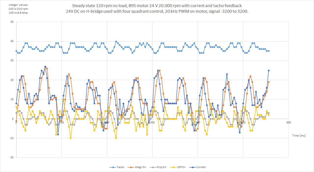 I can imagine the need to filter the speed signal with a time constant of 5 ms, but again I think it will cause severe problems for a fast speed control loop. I know that a small, brushed DC-motor used as tachogenerator can provide a speed signal with much less noise. If have used it for sewing machines, and with two amplifications of the analog value to provide a wider dynamic speed range. But a brushed DC-motor don’t provide a shaft angle that is needed for FOC.