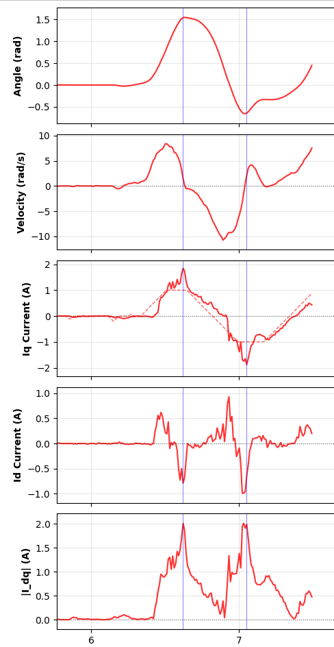 Actual Behavior: When the motor hits an obstacle, the measured iq_value spikes well beyond the target value (see attached diagram - red line shows measured current, dotted line shows target).