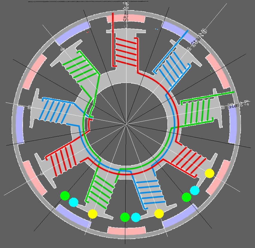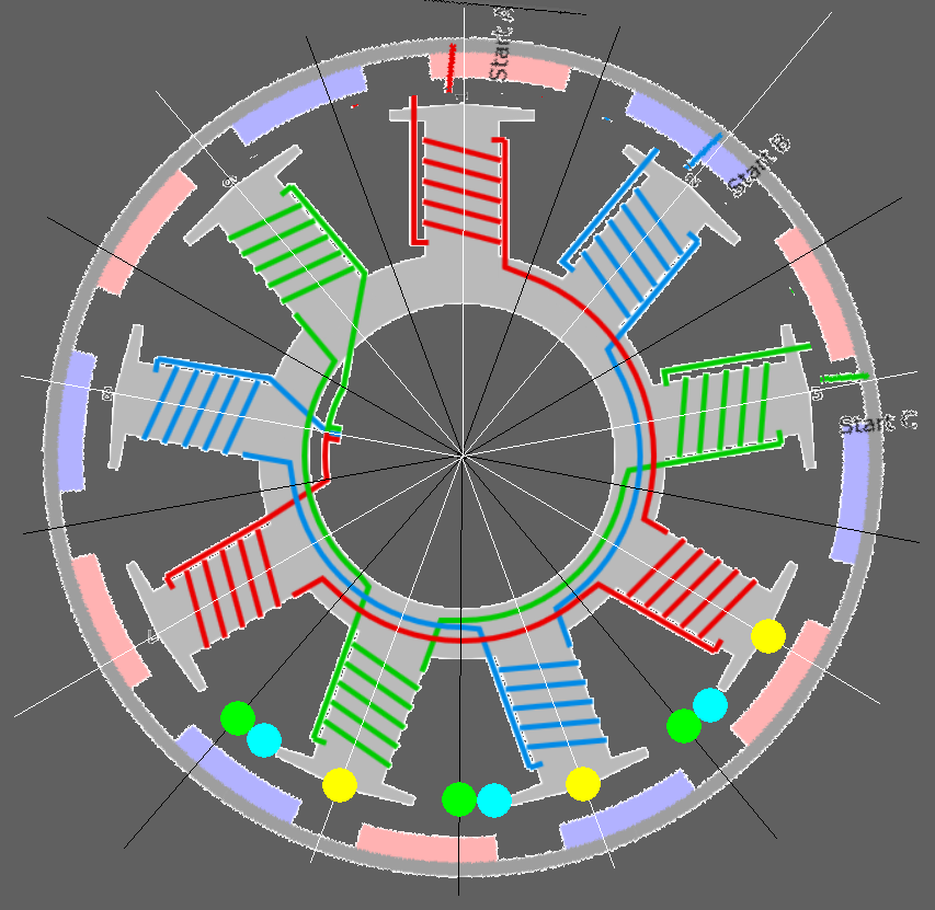 I’ve also made what I think is a more accurate sensor timing diagram. Energizing the red and blue coils should pull the rotor to this sort of position where two magnets are attracted to the two energized arms, and the idle green arms are pointed at gaps between magnets. This has the rotor turned 5 degrees from how I had it before, so now one cyan dot is centered on a magnet. That makes sense, because now that sensor won’t change state anytime soon, and the other two won’t change state either until the rotor has moved 10 degrees one way or the other.