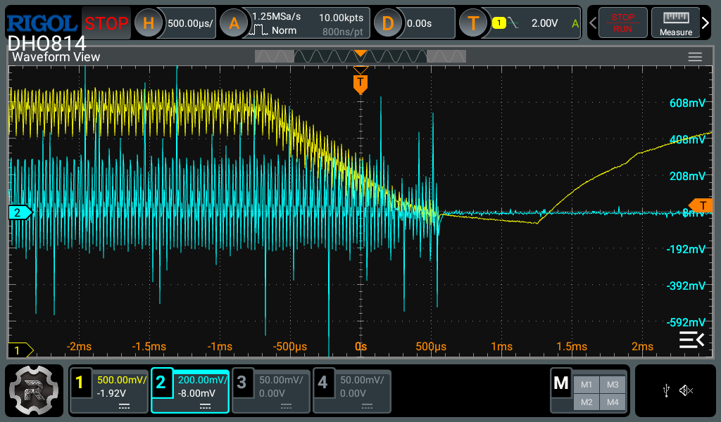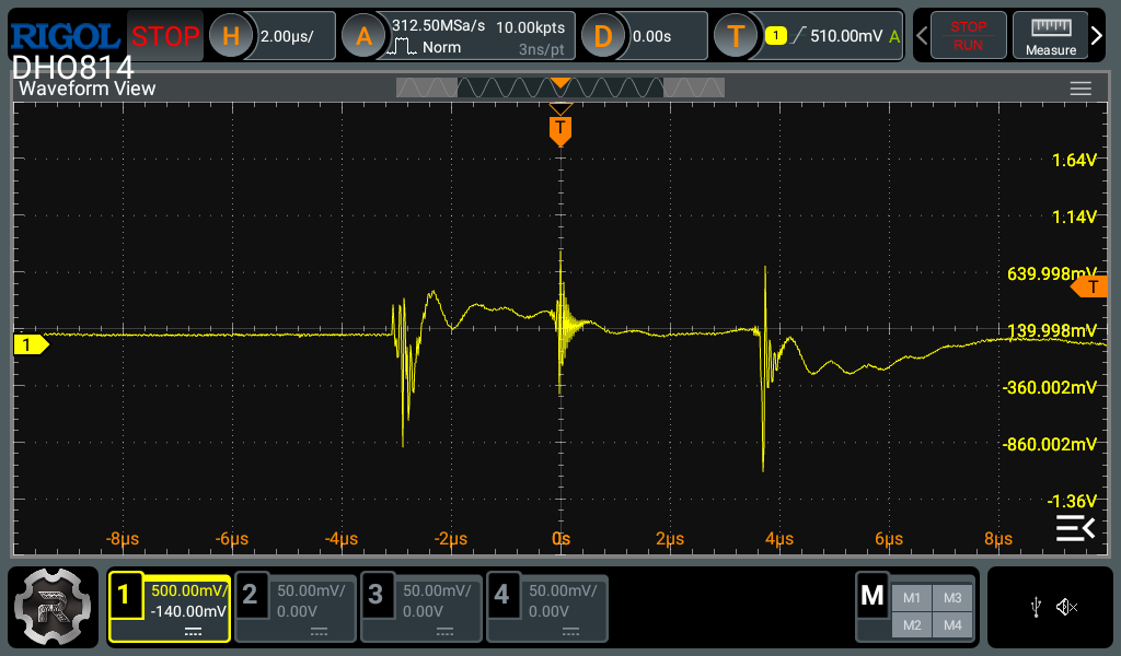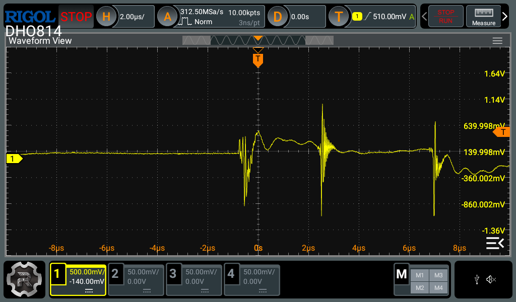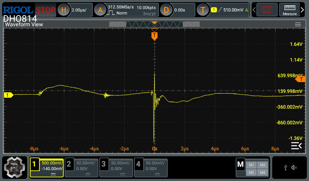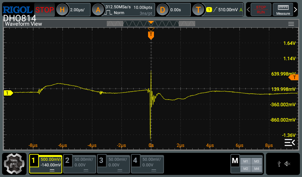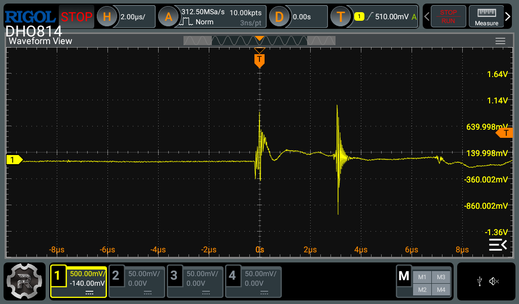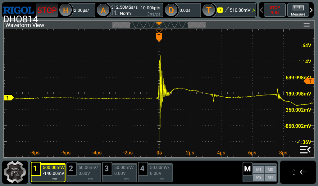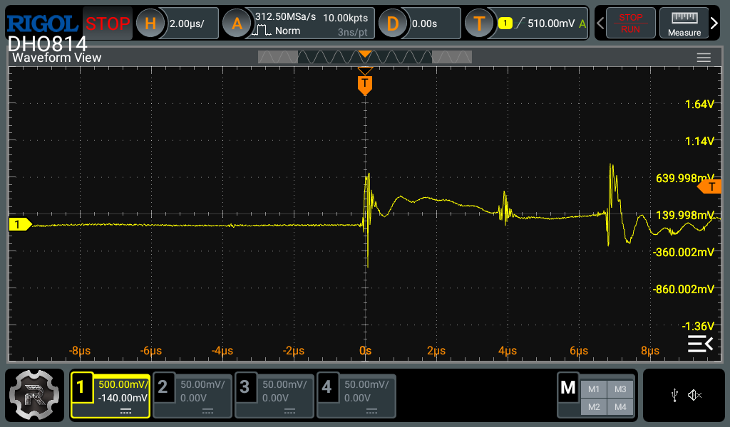 The second is the horizontal settings. Most modern digital oscilloscopes have a decent amount of memory to capture a lot of data in the horizontal axis, unlike the vertical axis. Therefore you can zoom in quite a bit in the horizontal axis before experiencing any artifacts caused by lack of data points. For single events like this, I usually go and set the memory depth to the maximum and use the biggest timebase which still maintains an acceptable sample rate (around 10x the highest frequency you expect to measure). This strategy gives the best change of actually capturing the event and what happened before and after. After the event is captured, you can then zoom in to the interesting parts to see the details.