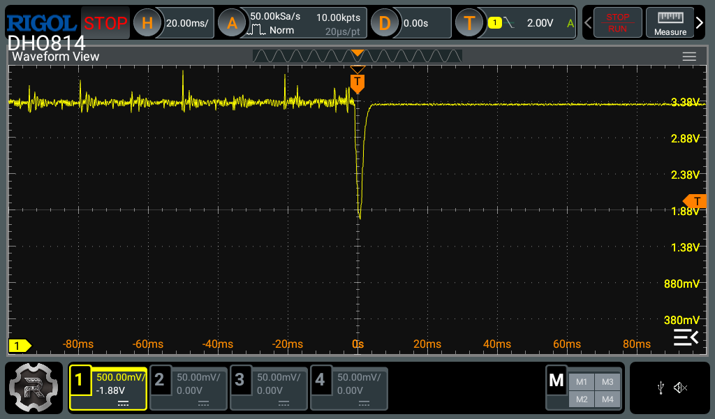 For this case itâs best to use the SINGLE mode, with the trigger set to falling edge with the trigger level at 2.0V, on the 3.3V rail signal. Use the other channels of the scope with more probes to capture the other signals of interest, keeping the first probe on the 3.3V rail signal (otherwise you lose the trigger). Keep in mind that the GND clips on all scope channels are shorted together. Start with a 1ms/div timebase and zoom in if you see anything interesting (especially near the start of the voltage dip).