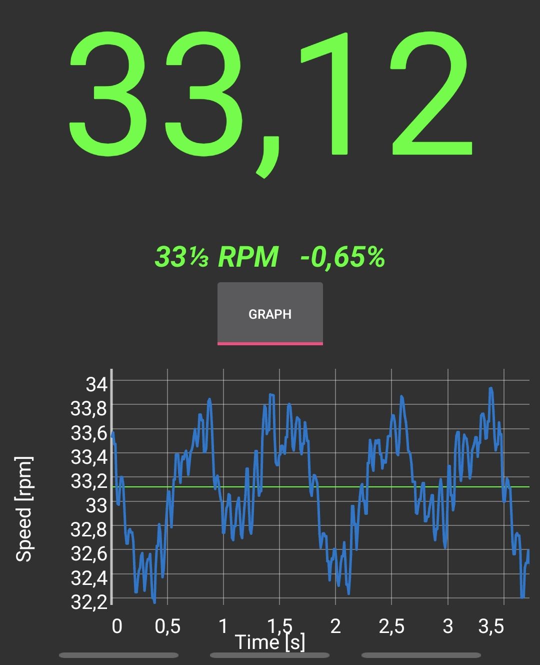 Hello fellow makers, I’d like to ask you for some directions regarding my somewhat unstable (yet repeating) chart of motor rpm. On picture, you can clearly see two periods of registered rotations, which are supposed to be around 33 and 1/3 rpm, but instead I get a floaty pattern, which can be also faintly heard in high pitch whisper coming from the motor.