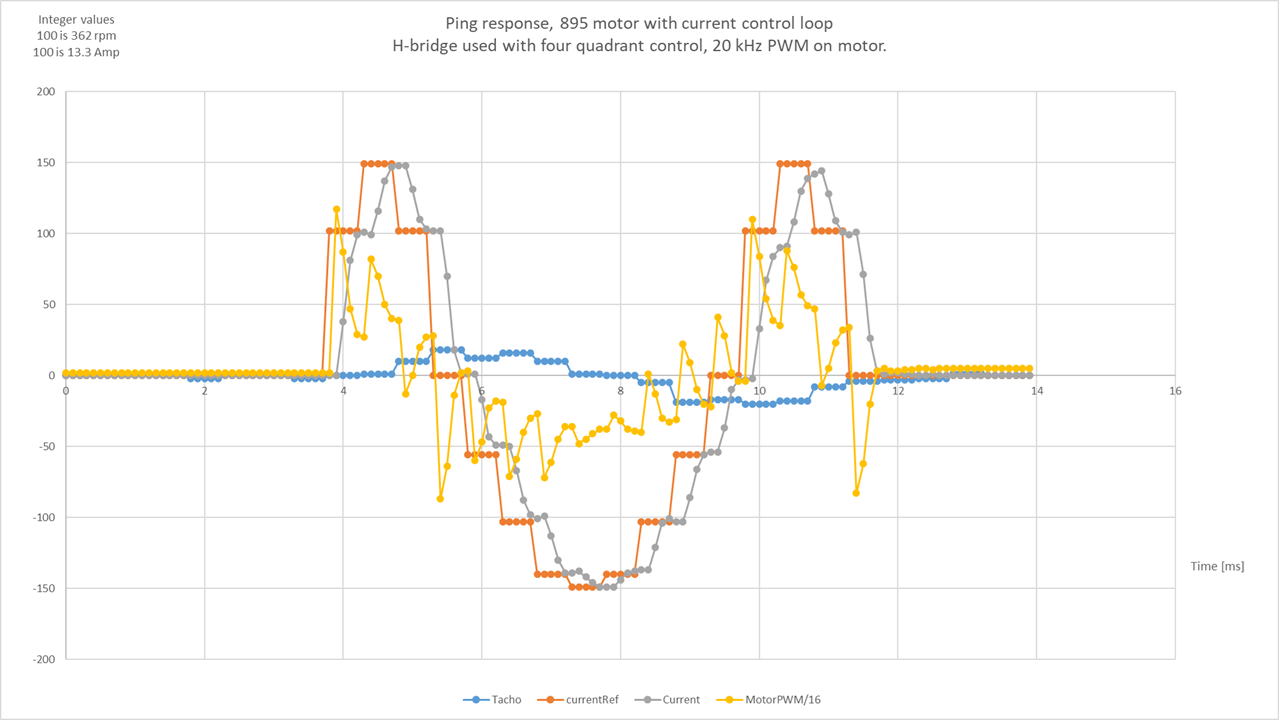 But I guess you may also use a short ping, to do some of that. I tried to apply a ping on a DC motor and look for the response in speed and some signals as you see below. A PI current control loop operate at 10 kHz. The ping is applied to the current reference, and it is changed each 0.5 ms. You see the response in speed, real current and PWM voltage signal.