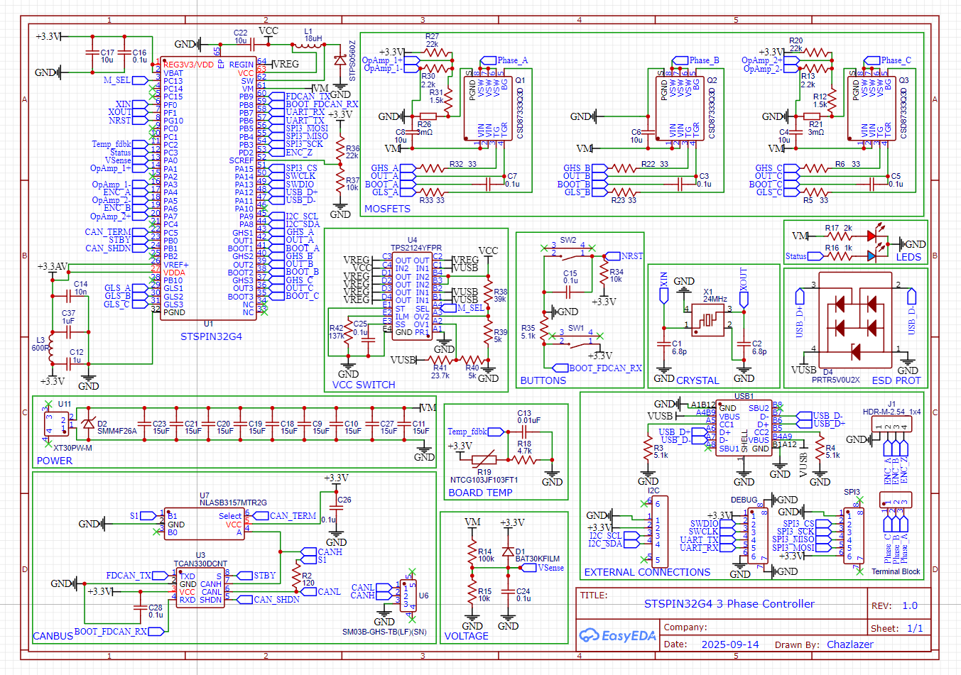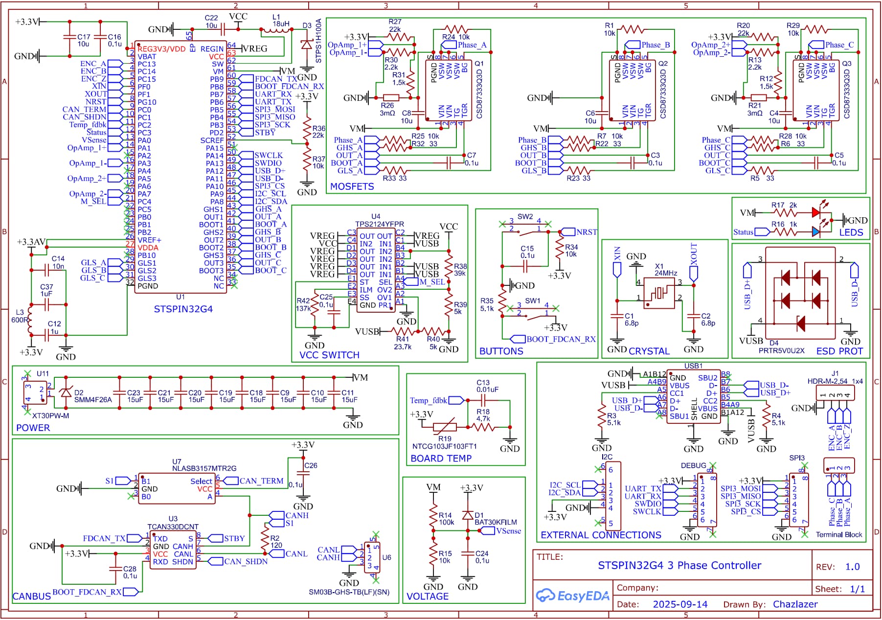 Re-did some of the schematic. I removed the resistors in-between the High and Low side mosfets. I saw some designs out there that don’t have these so I hope it’s okay. Also moved the mosfet capacitors to ground after the current sense resistors since it’s really close to power ground on the pcb. Also switched some of pins like the encoder, and used a different diode for the buck, the rest should be the same.