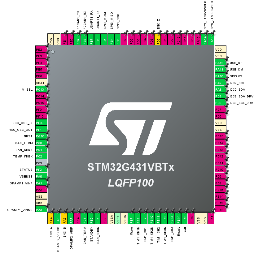 The encoder pins should be three channels of a timer so you can use the STM32HWEncoder class. If possible, make at least two of them ADC pins so it can use linear hall sensors too. PA4, PA6, PB0, PB1 are all TIM3 and ADC. Or PA0, PA2, PB10 are all TIM2, and two are ADC. And shouldn’t the encoder connector have a voltage supply pin?