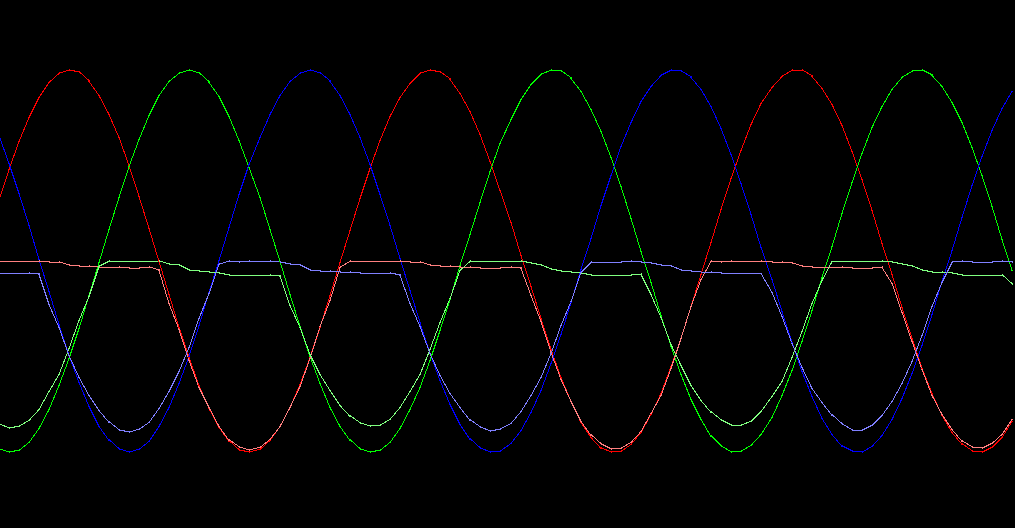 I hardcoded some gain and offset calibration to make the currents match closer to the voltage sine waves. Without that, the DC line steps up and down with the phase magnitudes, and the interpolation areas are slightly higher magnitude than they should be. Calibrating the gain would be no problem, but I don’t know how to sort out the offset from it. I may just go with a hardcoded 50mA offset, but I’ll need to assemble more of them and test to see how much variation there is.