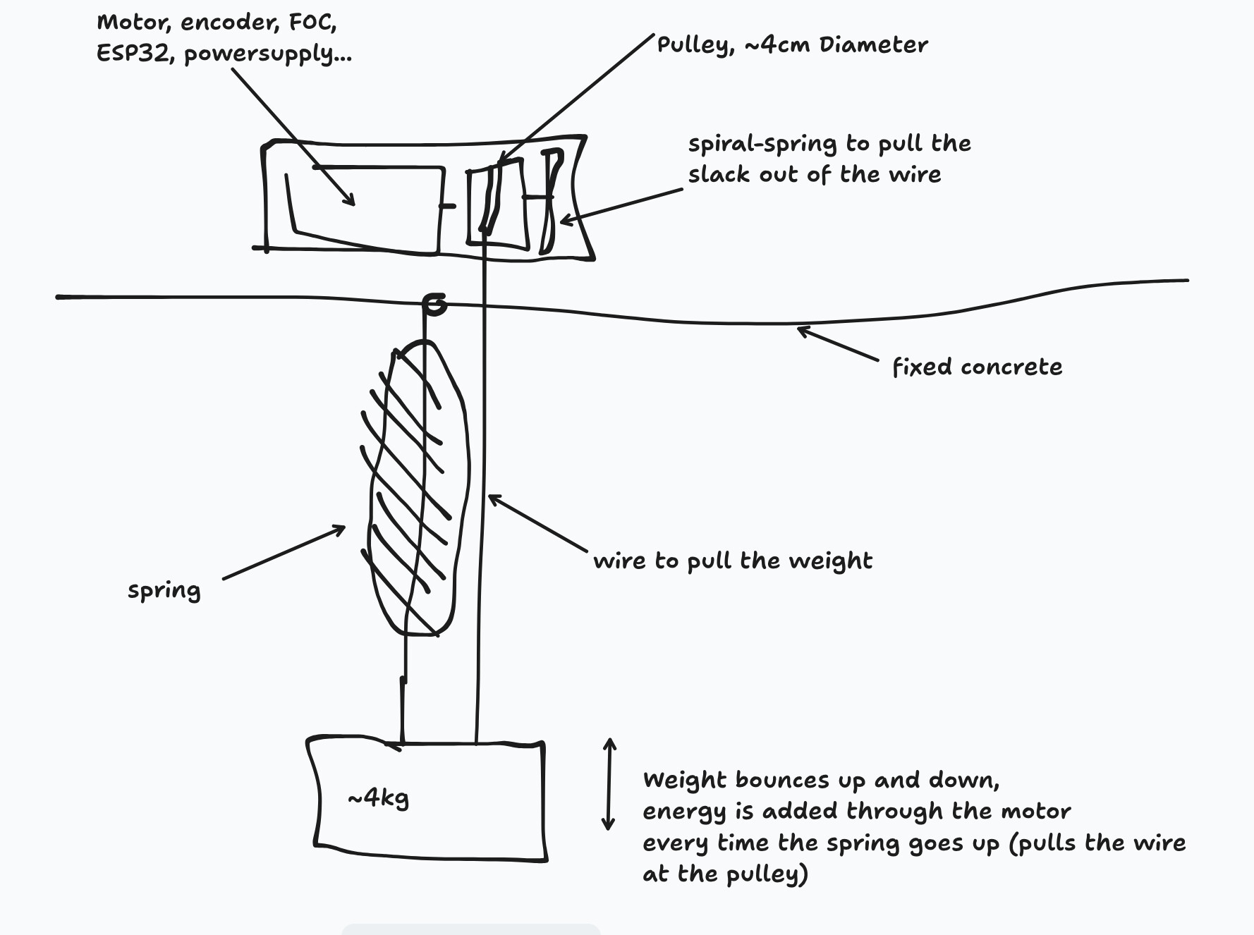 I am just starting to get to know SimpleFOC, so please excuse my possibly dumb questions. I have a GBM2804H with encoder ( IFlight IPower GBM2804H-100T / GM2804 Brushless Gimbal Motor with AS5048A Encoder/Aluminum Case for Camera Stabilizing Systems - AliExpress 26 ) to use with the SimpleFOCMini board. My general goal is to build a small machine that adds impulses to a spring mechanism to create an endless bouncing swing (hard to explain as a non-native English speaker). There is a spring attached to the ceiling, with a ~4 kg weight hanging from it. The idea is to have an algorithm that learns the amplitude and frequency, and then uses a pulley (connected via a wire to the bottom of the spring) to pull the spring whenever it contracts (it will be around ~10cm amplitude with around 1-2Hz).