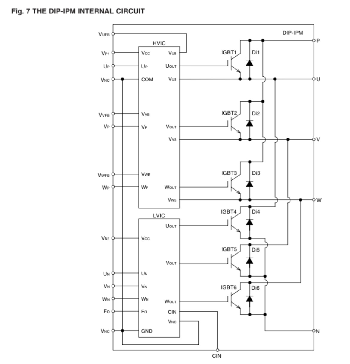 La fuente de alimentacion toma 110voltios de la red electrica, lo pasa por un puente rectificador y luego dos capacitores en una fuente simetrica que da 160voltios mas 160voltios, teniendo en los extremos positivo y negativo aproximadamente 320 voltios, este voltaje se aplica al “IPM” que controla las salidas W,U,V para el motor de la lavadora, las lavadoras LG usan el IPM Ps21964-4s, pero a mi me falta conseguir un programa para un ESP32 que combine las 6 salidas pwm, del lado alto y bajo para introducirla en el IPM Ps21964