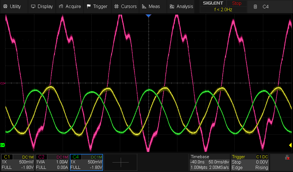 the current is measured with a current clamp (green), on the same branch that provides voltage (yellow).