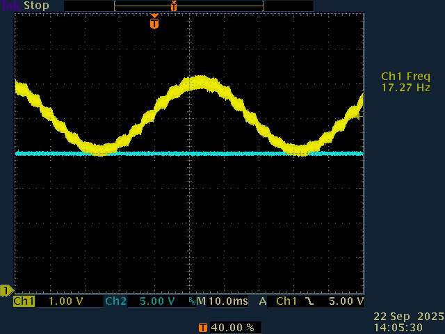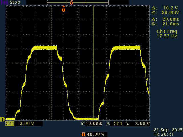Also double check that your driver.voltage_power_supply is correct. Looking back at your successful sine wave in post #39, the oscilloscope divisions are 5V, so peak to peak amplitude is ~16V. But since the code says 10+4*sin(i) it should be 8V peak-to-peak. The voltages you pass to setPwm are divided by voltage_power_supply to give the raw PWM duty, so if voltage_power_supply doesnāt match the actual power supply, then the actual output voltages wonāt match your commanded voltages either.
